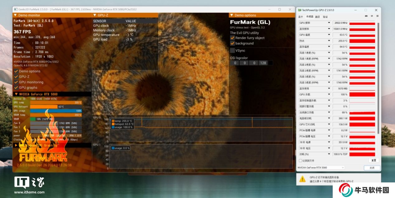 作為一款高端顯卡,GeForce RTX 5080 有著怎么的性能與性能釋放呢?接下來就進入理論測試環(huán)節(jié)。先看烤機,單烤甜甜圈 10 分鐘,GPU 的核心溫度穩(wěn)定在 63.5℃左右,要比公版的 73.4°C 低很多,顯卡頻率 2600MHz,整張顯卡的功率在 360W 左右,與英偉達官方的 TGP 保持一致。搭配 i7 / i9 或銳龍 7、銳龍 9 這樣的高端處理器,1000W 的電源足矣。