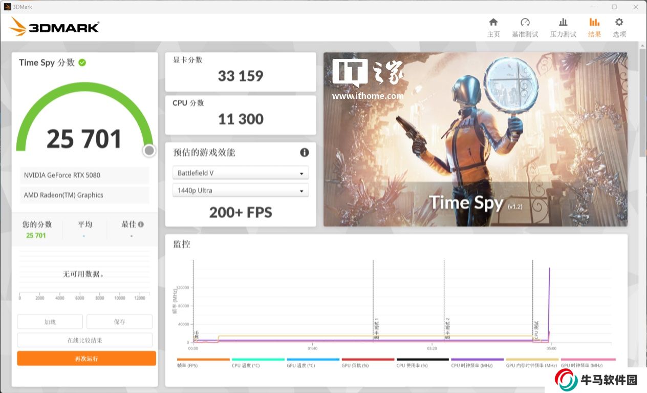 在 3DMark Time Spy DX12 測試中,技嘉 GeForce RTX 5080 GAMING OC 16G 分數(shù)達到了 33159 分,比公版的 32022 要高出一千多分。作為對比 GeForce RTX 4080s 公版的分數(shù)為 29220 分,提升約為 13%,提升幅度較大。