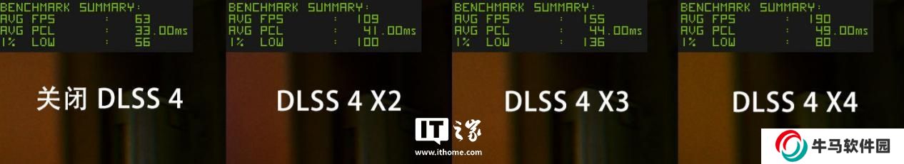我們依次在 4K 分辨率 + 超級光追畫質 + DLSS 性能設置下,選擇 2x、3x 和 4x 多幀生成,運行游戲基準測試,分別得到了 149.49 幀、206.15 幀和 255..69 幀的游戲平均幀數(shù),2x 和 3x 多幀生成的表現(xiàn),非常接近 71.25 幀的 2 倍和 3 倍幀數(shù),在 4K 分辨率下超 240 幀的超級光追畫質體驗遠超我們的預期,畫面流暢度極高。