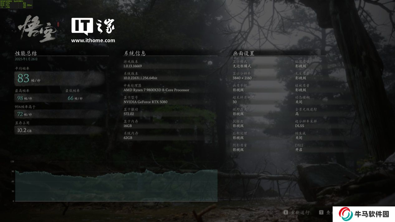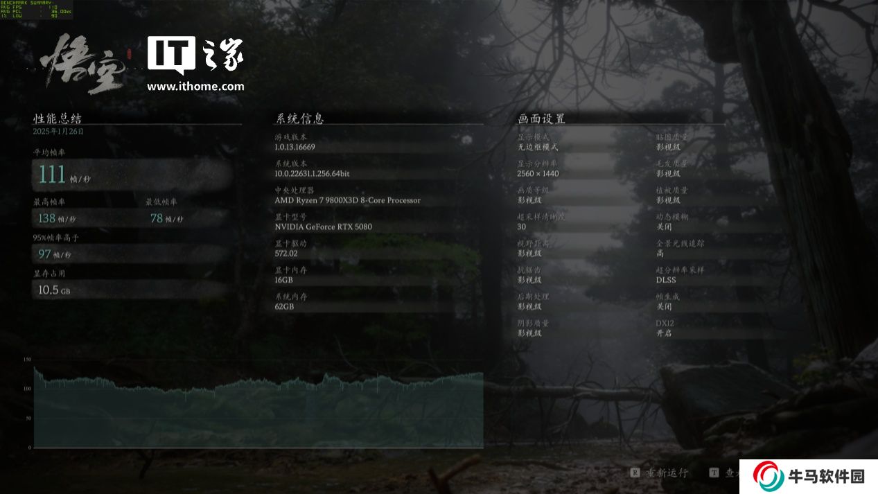 可以看到在 RTX 5080 的加持下,4K 分辨率 + 影視級畫質的黑猴也能達到 120 幀以上的游戲平均幀數(shù),體驗提升巨大。