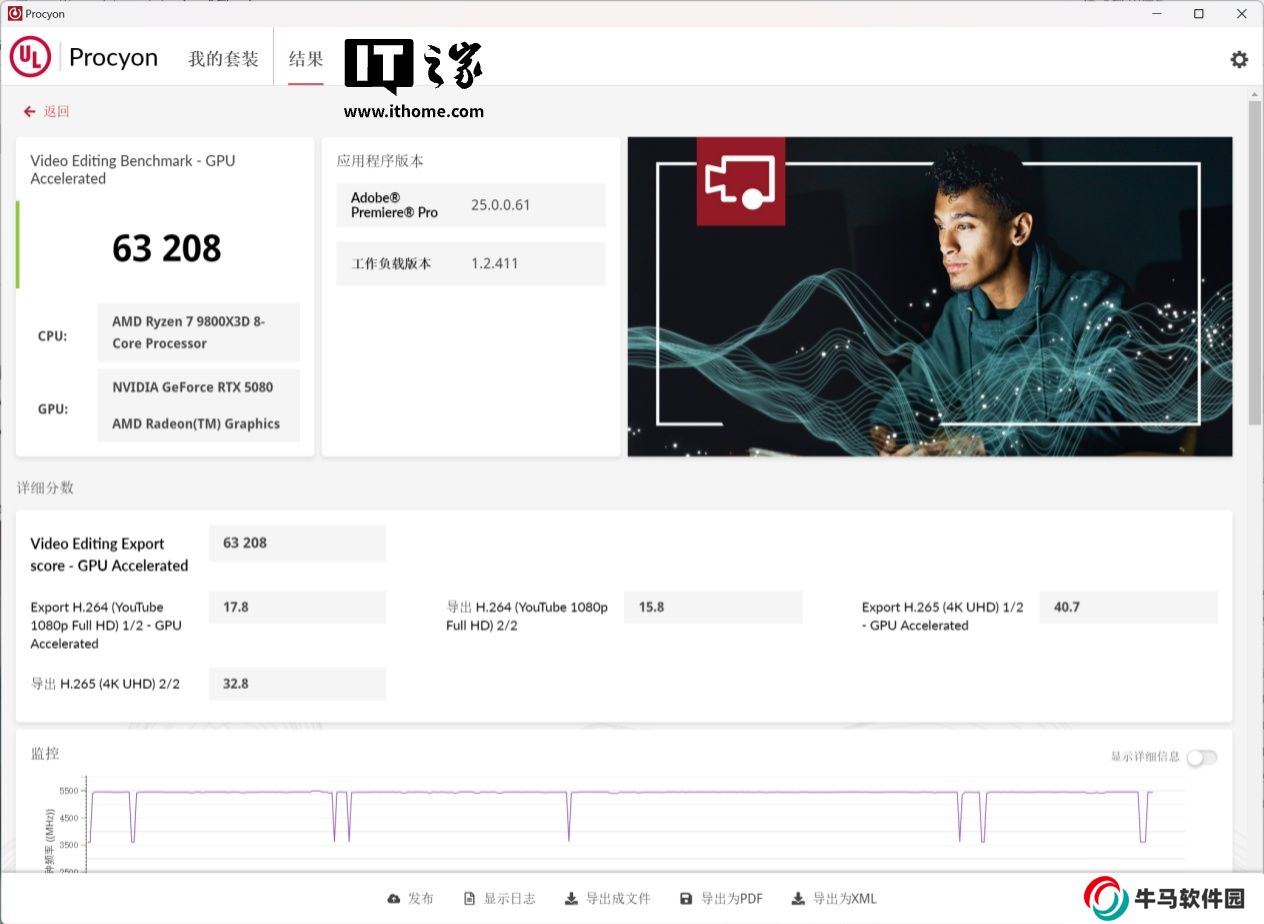 在視頻剪輯性能測試中我們開啟了 GPU 加速,得益于 RTX 5080 Blackwell 架構的第九代 NVENC,其在 H.264 / H.265 4:2:2 編碼的 8 位和 10 位視頻上有著非常大的優(yōu)勢,技嘉魔鷹 RTX 5080 最終獲得了 63208 分,比公版 RTX 5080 高了 575 分。