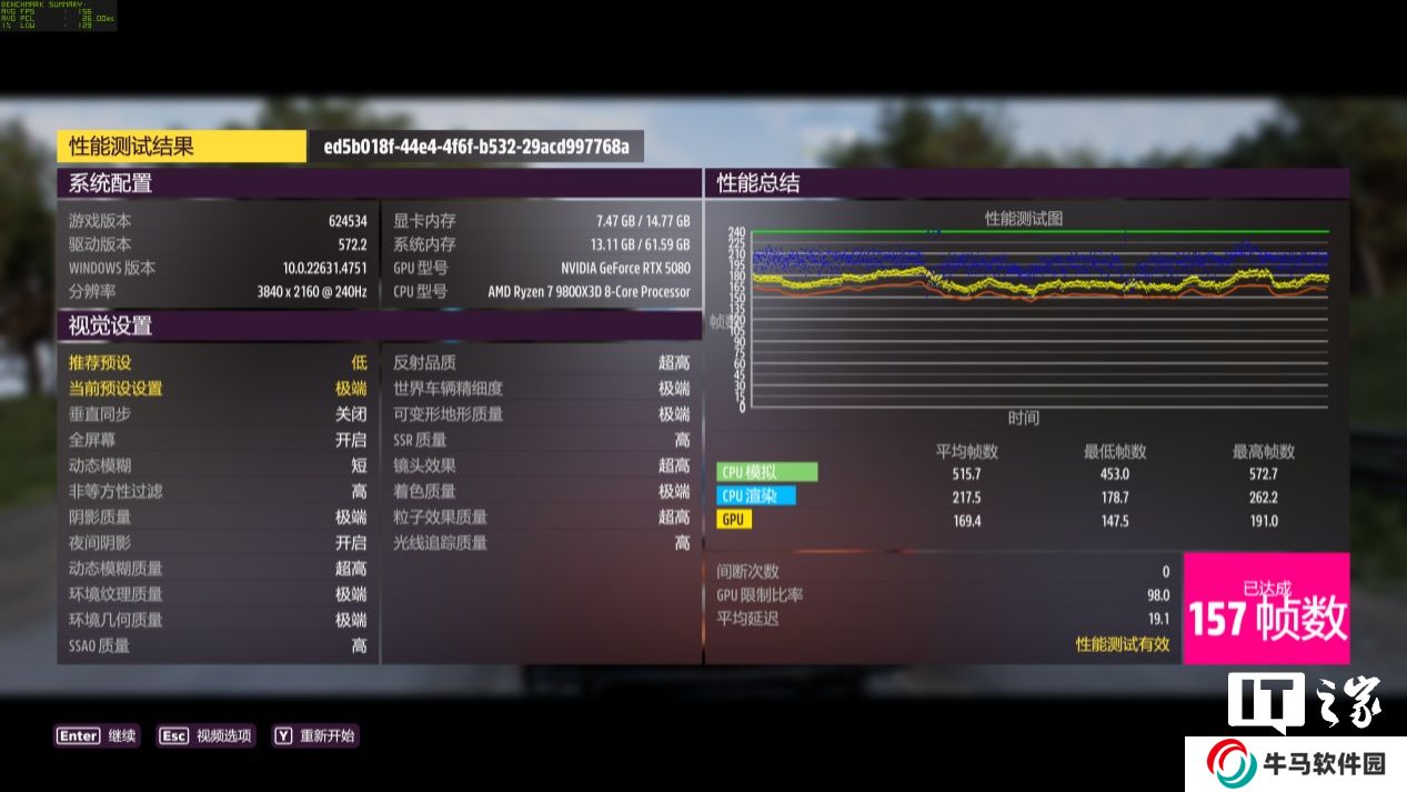 在 4K 分辨率 + 極端畫質下,游戲平均幀數(shù)為 157 幀,1% Low 幀 129 幀;