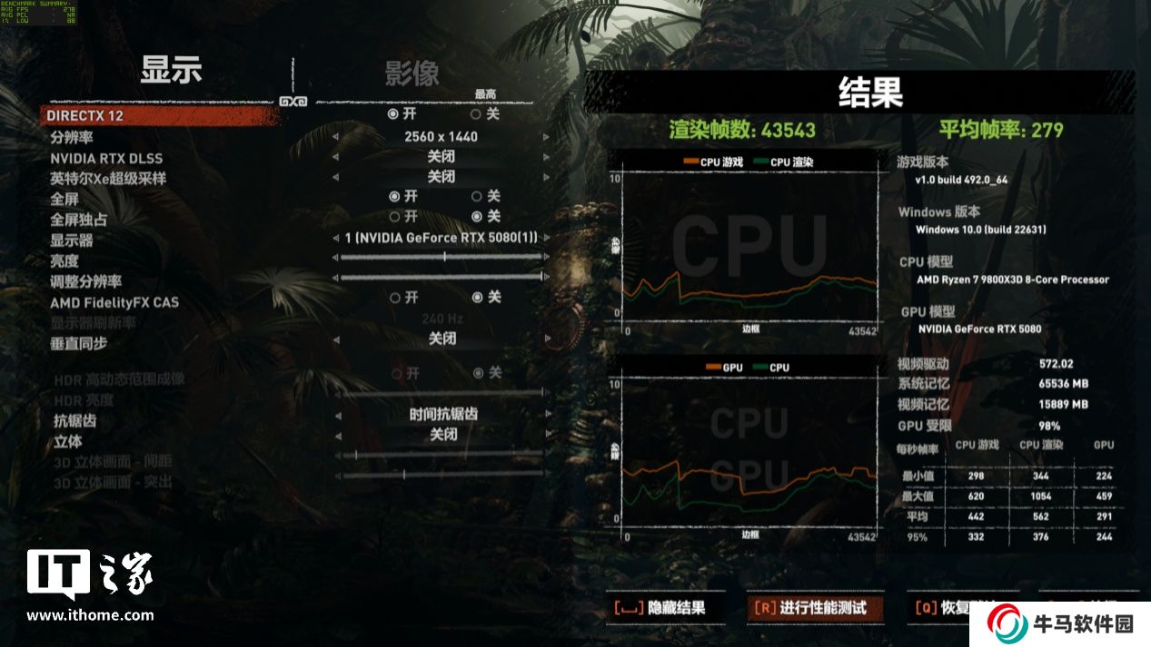 在 2K 分辨率 + 最高畫質下,游戲平均幀數(shù)為 279 幀;
