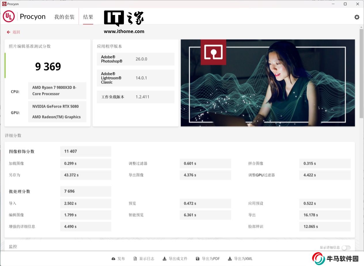 生產(chǎn)力方面,本站實測了 UL Procyon 的照片編輯、視頻剪輯、以及 AI 文本撰寫等性能。在照片編輯上,技嘉魔鷹 RTX 5080 配合 AMD 9800X3D 獲得了 9369 分比公版 RTX 5080 高了 683 分。