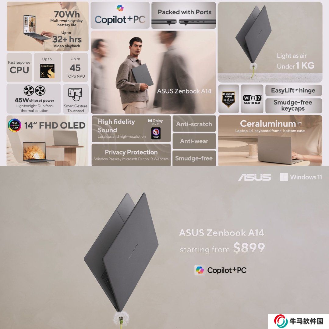 華碩表示,Zenbook A14是首款搭載驍龍X系列AI處理器的Zenbook筆記本電腦,重量極輕,整機為 988 克,而且“經(jīng)久耐用且維護(hù)成本低”,該機配備70Wh電池,充一次電即可連續(xù)播放視頻超過32小時,而且49分鐘即可將電量充至60%,且“無需插電即可工作,性能無任何損失”。