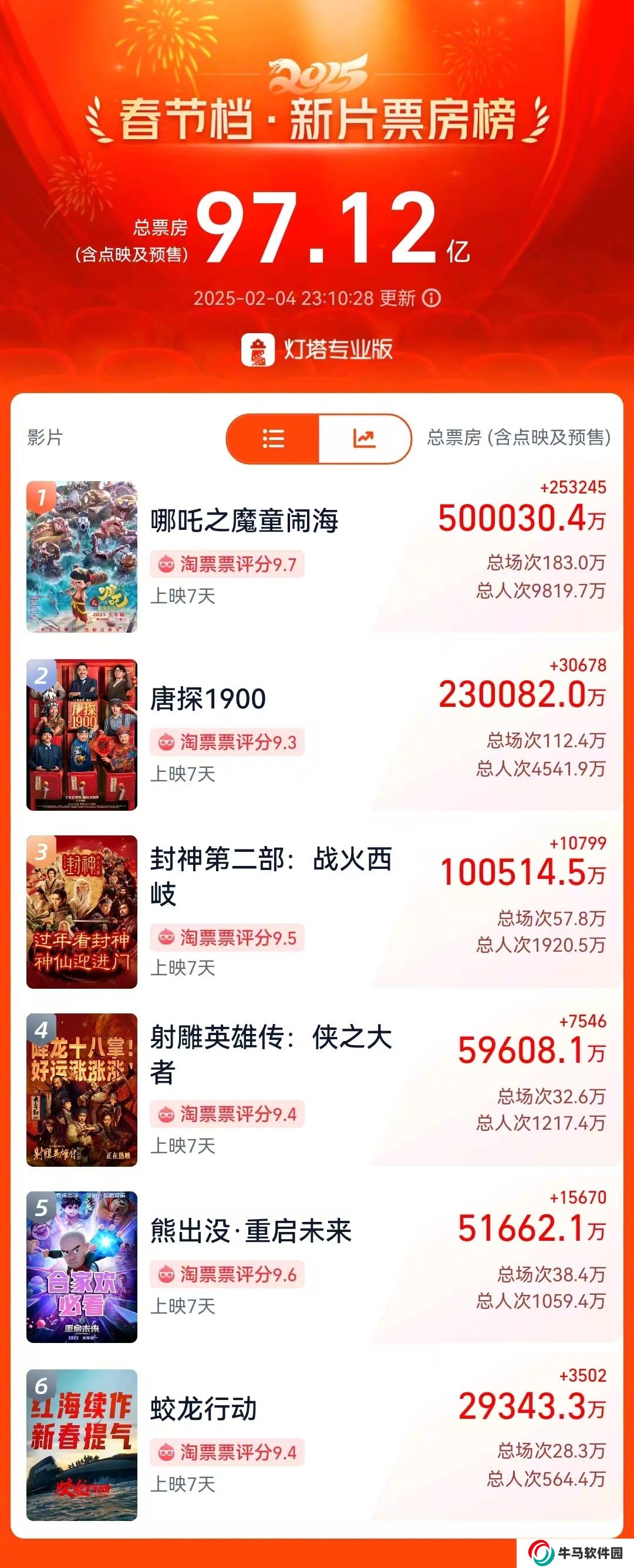 本站 2 月 4 日消息,據(jù)燈塔專業(yè)版,2 月 4 日 23 時(shí)許,《哪吒之魔童鬧海》上映 7 天總票房突破 50 億,再次刷新影史票房最快破 50 億紀(jì)錄。與此同時(shí),2025 春節(jié)檔總票房突破 97 億。