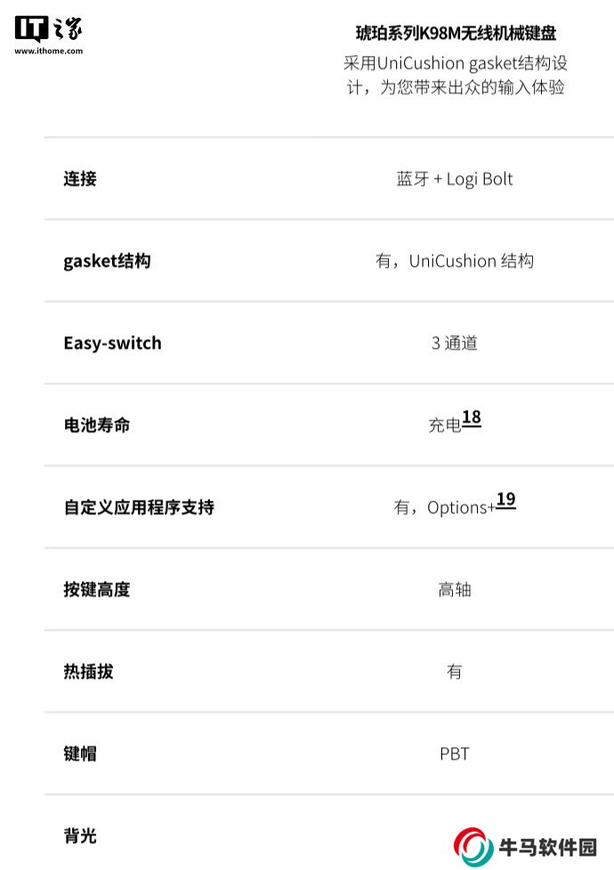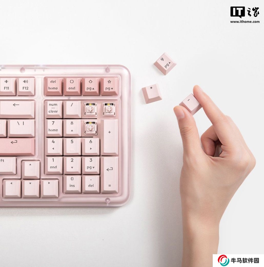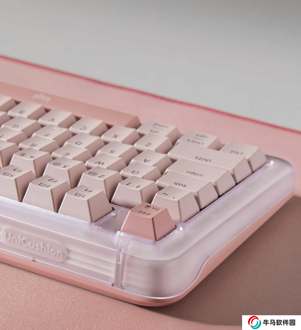 據(jù)羅技介紹,這款鍵盤整體使用玫瑰粉配色,使用 98鍵配列,帶有白色背光,使用透光PBT 鍵帽,采用大中底 UniCushionGasket 墊片結(jié)構(gòu),配備輕音軸,支持熱插拔、全鍵無沖。