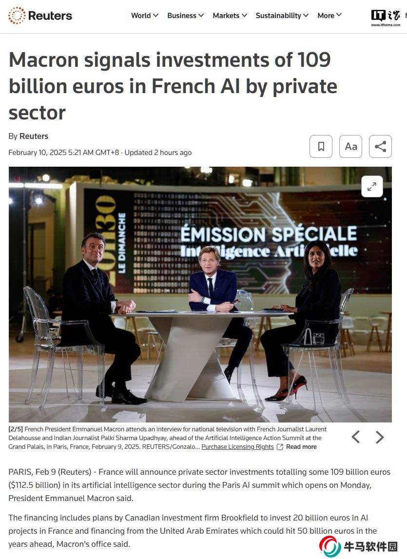 其中,加拿大投資公司 Brookfield 計(jì)劃向法國(guó)人工智能項(xiàng)目投入 200 億歐元(當(dāng)前約 1510.02 億元人民幣),阿聯(lián)酋未來(lái)幾年內(nèi)的投資可能高達(dá) 500 億歐元(當(dāng)前約 3775.04 億元人民幣)。