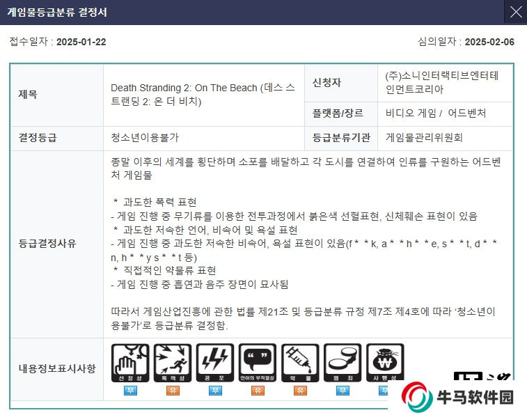 韓國審查機構(gòu)警告稱,《死亡擱淺 2》被描述為在末日后的世界中通過遞送包裹來連接城市和拯救人類的冒險游戲。