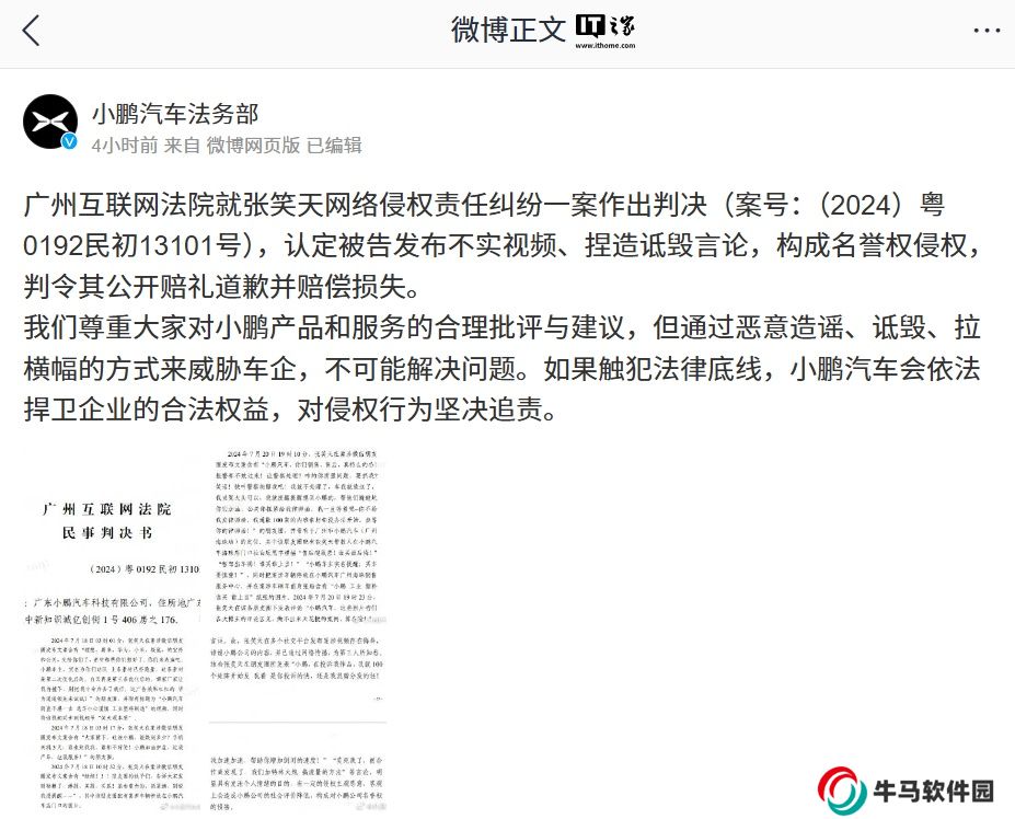 本站 2 月 11 日消息,小鵬汽車法務部今日公開了廣州互聯(lián)網(wǎng)法院對張笑天網(wǎng)絡侵權責任糾紛一案作出的判決結果。本站附原文內(nèi)容如下: