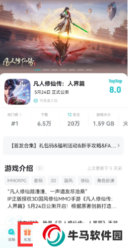 2、進入游戲詳情頁面以后,我們找到左下角的禮包圖標,進入禮包領取頁面。