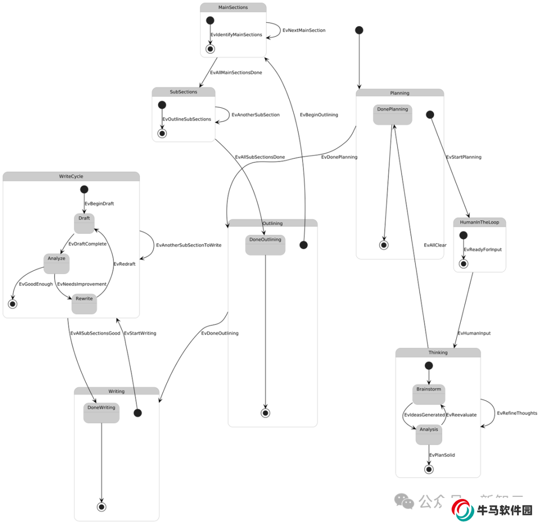 比如在每一個寫作周期(writeCircle),都包含了起草、分析和重寫 3 個節(jié)點,而每個節(jié)點都是獨立的系統(tǒng)。