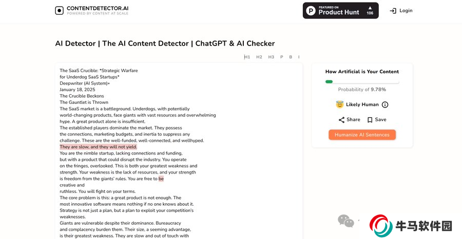 只從寫作質(zhì)量上看,內(nèi)容檢測系統(tǒng)給出的結果是:AI 生成的概率為 9.78%。