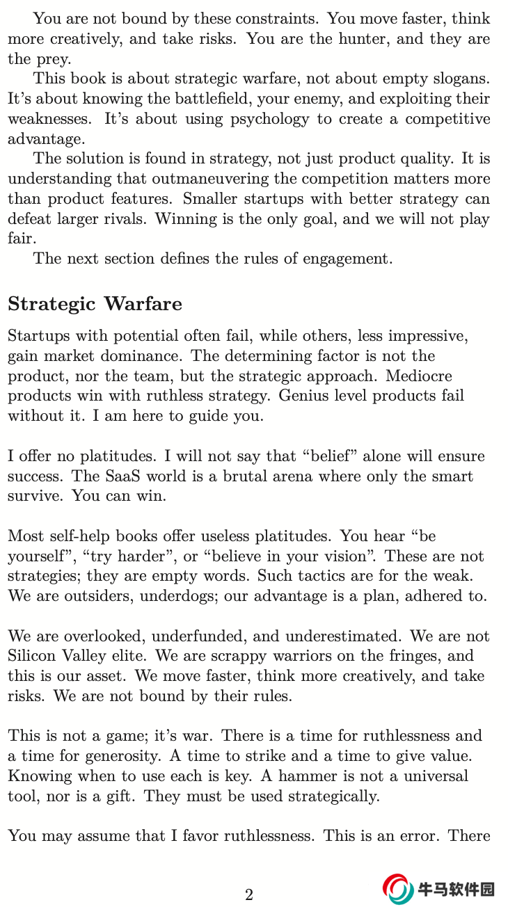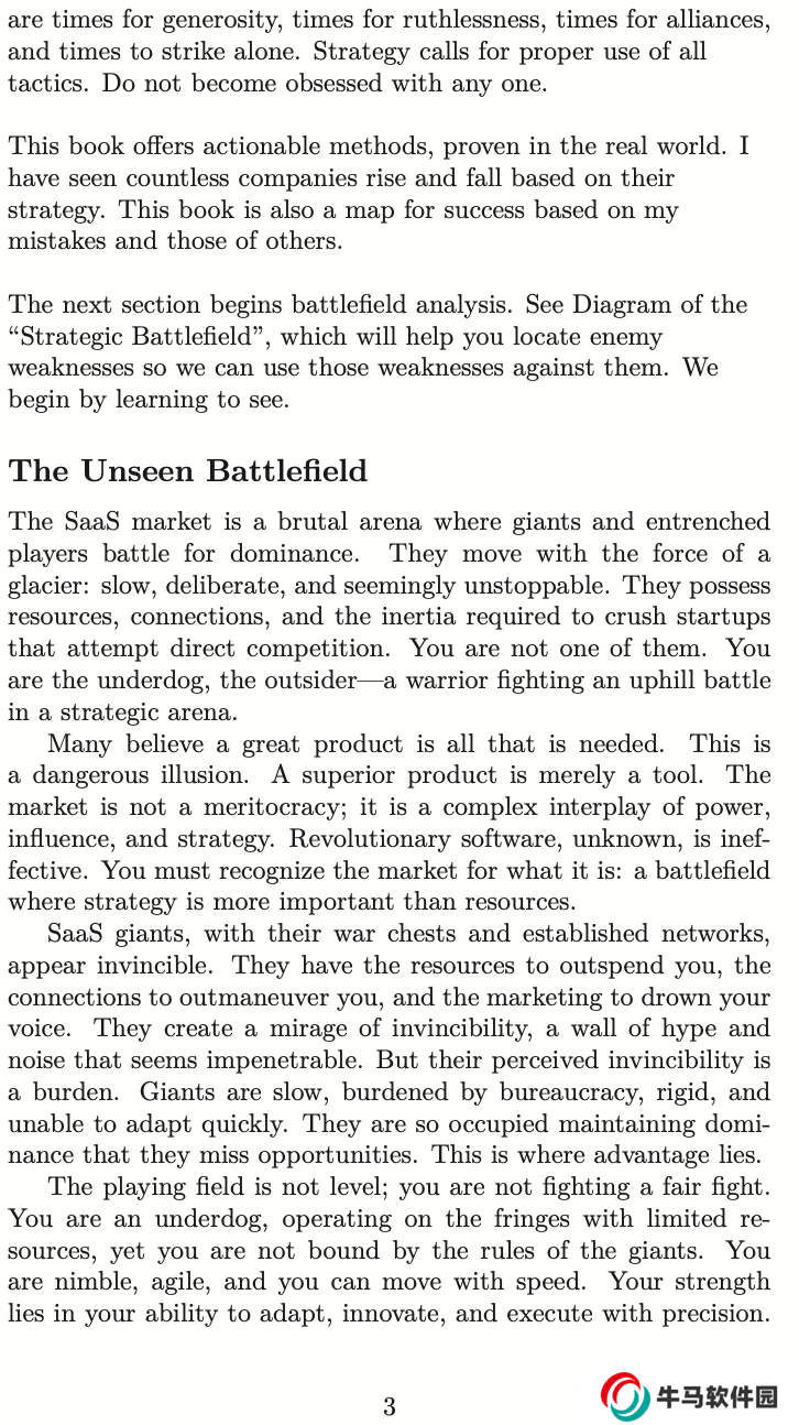 本章節(jié)作為 SaaS 初創(chuàng)公司戰(zhàn)略世界的引言,通過一個引人入勝的開篇立即抓住讀者的注意力,確立了資源匱乏的初創(chuàng)公司與行業(yè)巨頭競爭的核心問題。它為本書定下了嚴肅的戰(zhàn)略指南基調(diào),同時帶有一些黑色幽默,突顯了“我們對他們”的心態(tài),并提醒沖突的雙重性。