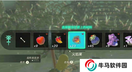2、因?yàn)槭窍卵┨?,所以我們使用火焰果也是可以的,將火焰果附加在箭上面,然后射出去的箭就有了燃燒的作用?/p>