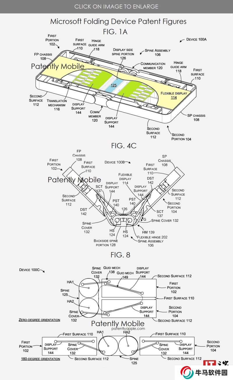 在專利圖 1A 中,可以看到設(shè)備配備的柔性顯示屏#114 具體細(xì)節(jié),顯示該機(jī)使用業(yè)界通用的大折疊手機(jī)折疊方案,鉸鏈支持360度旋轉(zhuǎn),整體風(fēng)格有點(diǎn)類似當(dāng)年的Surface Duo,考慮到該機(jī)采用柔性面板,這對(duì)于工程學(xué)來說挑戰(zhàn)較大。