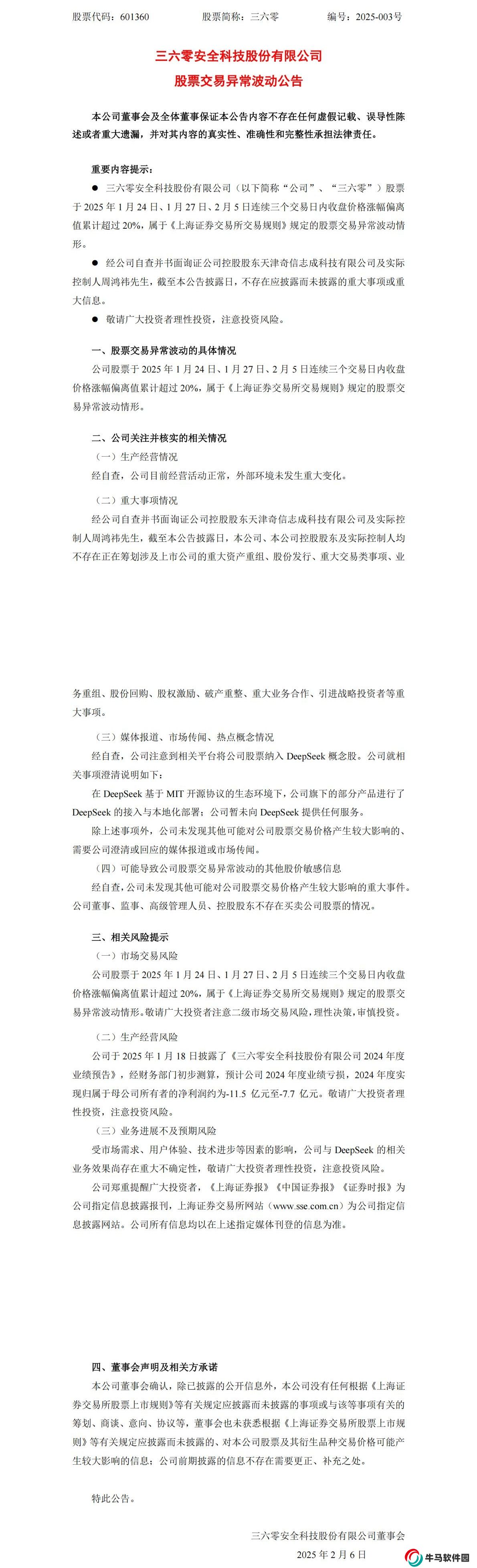 本站 2 月 5 日消息,三六零安全科技股份有限公司今日發(fā)布股票交易異常波動公告,稱公司股票于 2025 年 1 月 24 日、1 月 27 日、2 月 5 日連續(xù)三個交易日內收盤價格漲幅偏離值累計超過 20%,屬于《上海證券交易所交易規(guī)則》規(guī)定的股票交易異常波動情形。