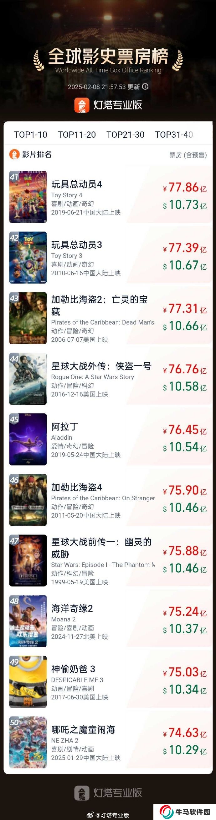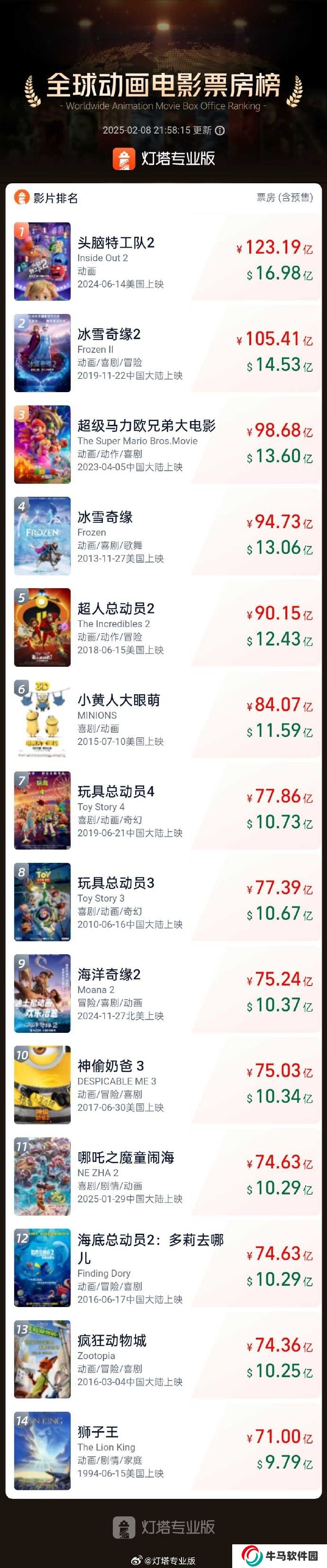 本站 2 月 8 日消息,據(jù)燈塔專業(yè)版,截至 2 月 8 日 21 時 57 分,影片《哪吒之魔童鬧海》票房(含預售)突破 74.63 億,進入全球影史票房榜前 50(唯一非好萊塢影片),同時進入全球動畫片票房榜前 11。