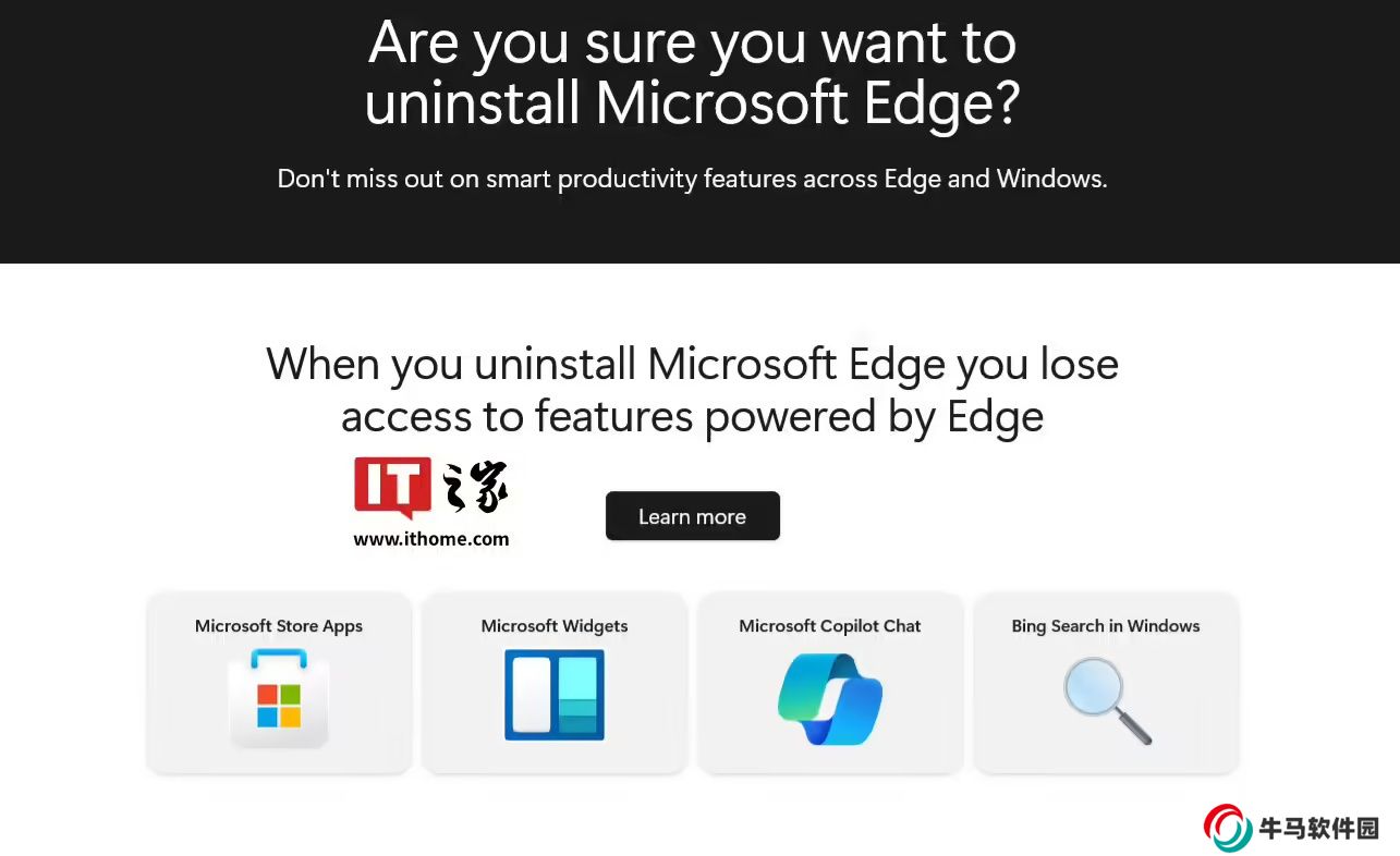 本站注意到,如今該鏈接已指向一個新的網(wǎng)頁,其內(nèi)容不再偽裝成“卸載 Edge 指南”,而是著重推廣 Edge 瀏覽器本身及其功能特性。例如,網(wǎng)頁介紹了 Edge 瀏覽器的集成 Copilot 功能、垂直標簽頁、改進的能效表現(xiàn),以及其他一些真正實用的功能。同時,微軟還移除了之前用于比較 Edge 和 Chrome 的表格。