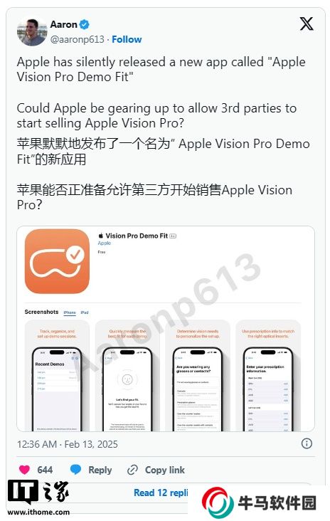 這一推測是基于代碼偵探 Aaron P 發(fā)現(xiàn)的 Apple Vision Pro Demo Fit 應(yīng)用程序。據(jù)本站了解,目前蘋果要求用戶通過 Apple Store 應(yīng)用程序來確定 Apple Vision Pro 配件的尺寸,并且此前僅通過其線上和線下官方商店直接銷售 Apple Vision Pro。