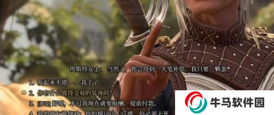 2、緊接著和埃斯特女士對(duì)話,然后選擇【你有什么值得交易的裝備嗎?】,就能開始和她進(jìn)行交易。
