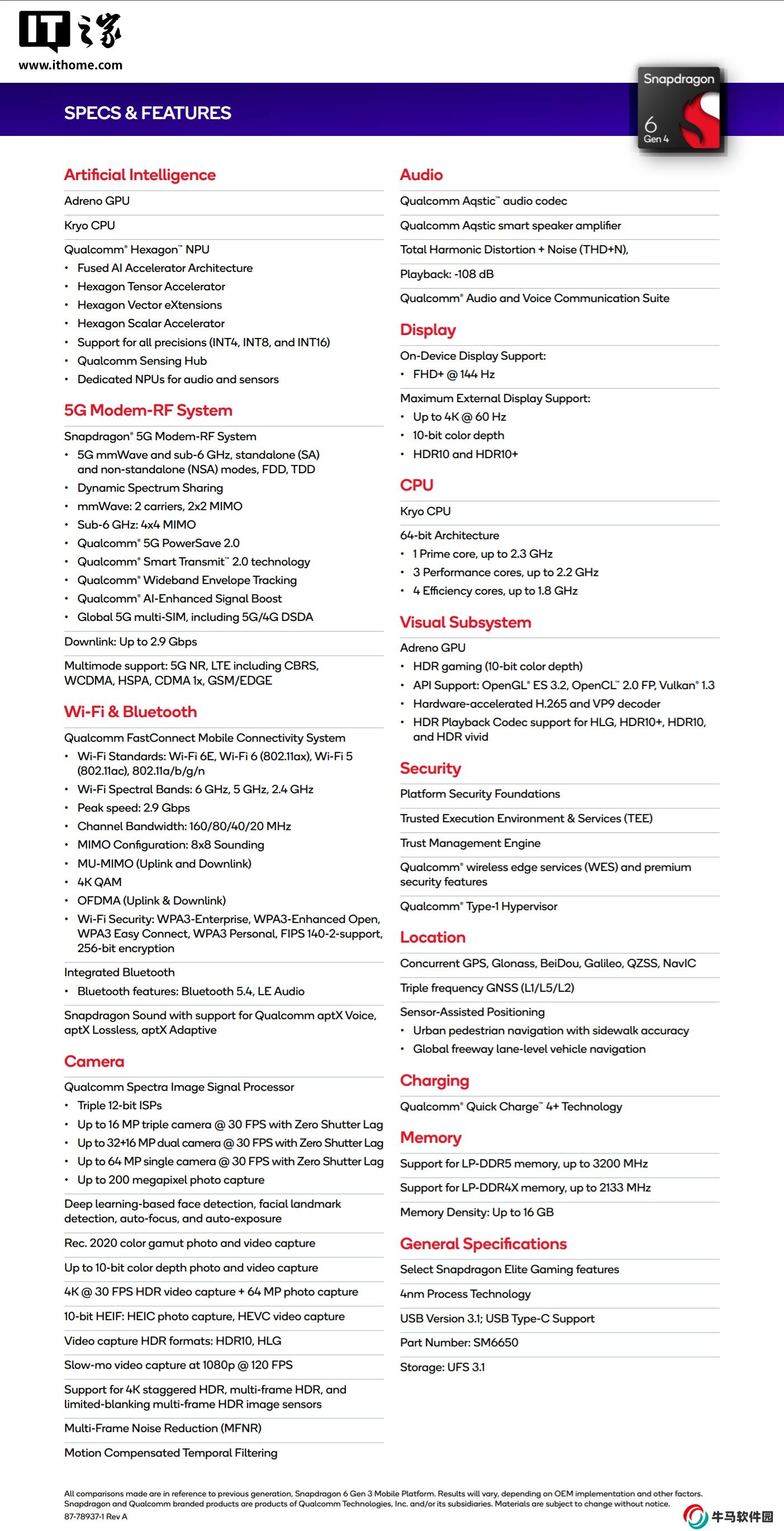 驍龍 6 Gen 4 基于臺積電 4nm 工藝制造,這也是 6 系列芯片首次采用 4nm 制程(之前使用三星 4nm 和臺積電 6nm 工藝)。