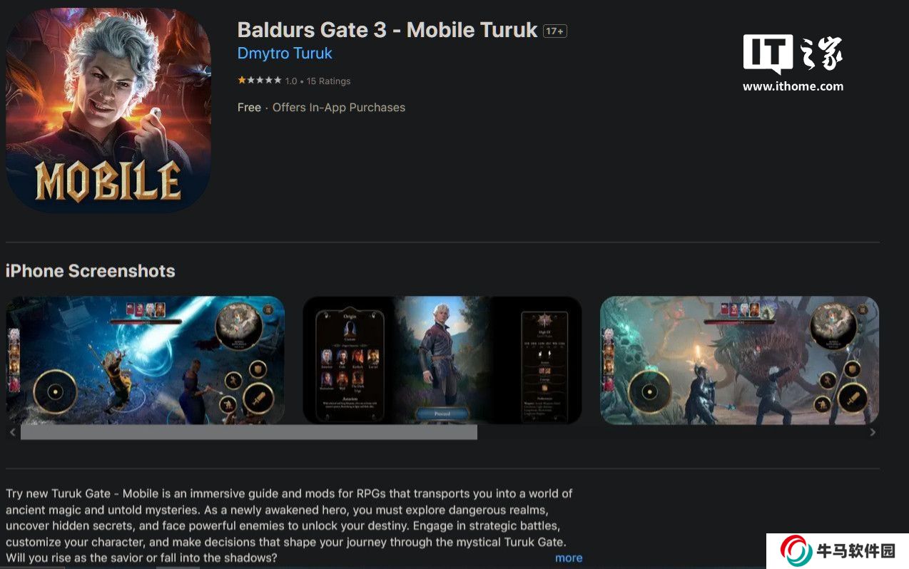 據(jù) VideoGamer 報道,這款假冒應用名為“Baldurs Gate 3 - Mobile Turuk”,開發(fā)者標注為“Dmytro Turuk”。應用使用了經(jīng)過修改的游戲截圖,并添加了虛假的移動端操作界面。應用中未提及《博德之門 3》與《龍與地下城》的淵源,也未提到開發(fā)商 Larian Studios。