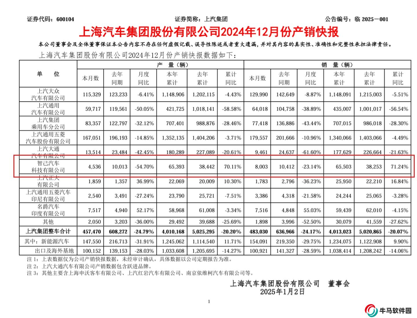 本站查詢上汽產(chǎn)銷快報(bào)獲悉,智己汽車 2024 全年銷量 65503 輛,同比增長(zhǎng) 71.24%;2024 年 12 月銷量 8003 輛,同比減少 23.14%。