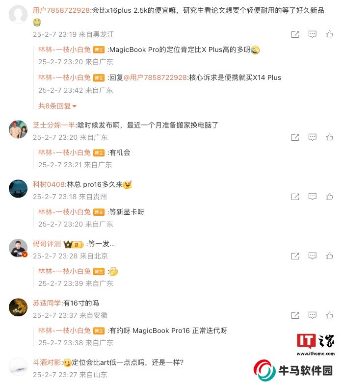 另外,林林還在評論區(qū)中回復(fù)了部分網(wǎng)友的問題:針對新筆電的是否會比 X16 Plus 便宜,他稱“MagicBook Pro 的定位肯定比 X Plus 高的多呀”;針對 Pro 16 筆記本發(fā)布時間,他回復(fù)“等新顯卡”。