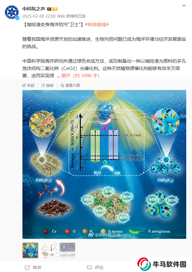 中國科學(xué)院海洋研究所宣布在綠色合成光催化防污材料方向取得重大突破,成功利用廢棄咖啡渣制備出新型多孔泡沫結(jié)構(gòu)二氧化鈰(CeO2)光催化劑。