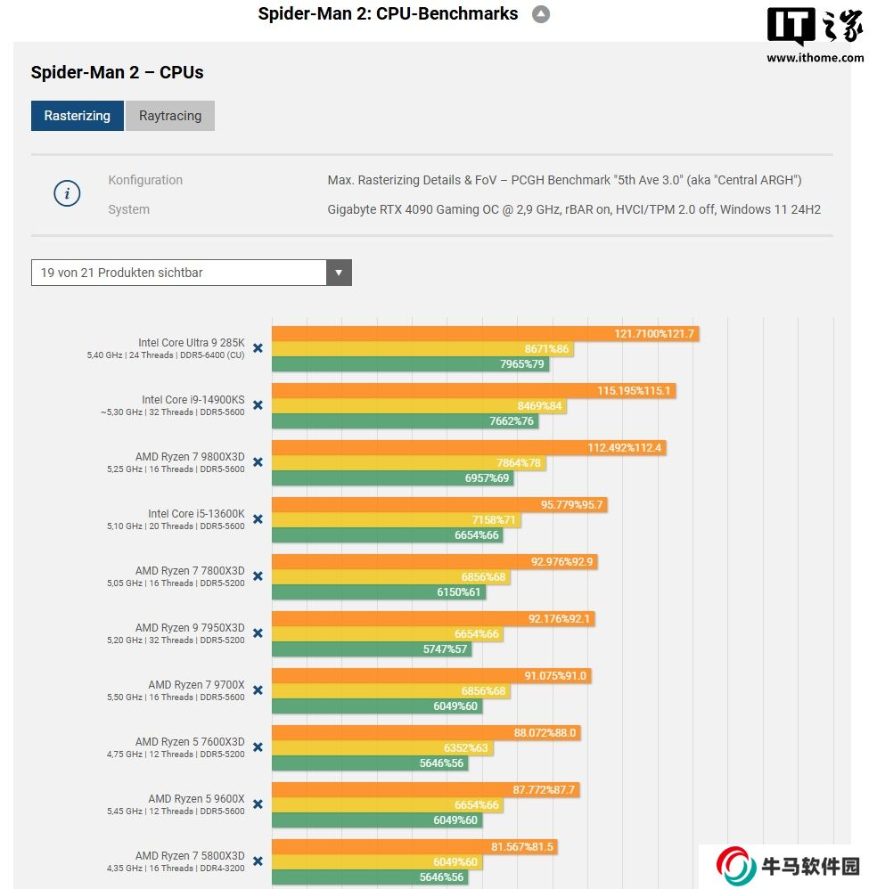 本站 2 月 8 日消息,德國(guó)媒體 PCGamesHardware 今天對(duì)《漫威蜘蛛俠 2》PC 版進(jìn)行了測(cè)試,結(jié)果發(fā)現(xiàn)英特爾 Ultra 9 285K 處理器表現(xiàn)異常出色,甚至完勝了 AMD 銳龍 7 9800X3D。