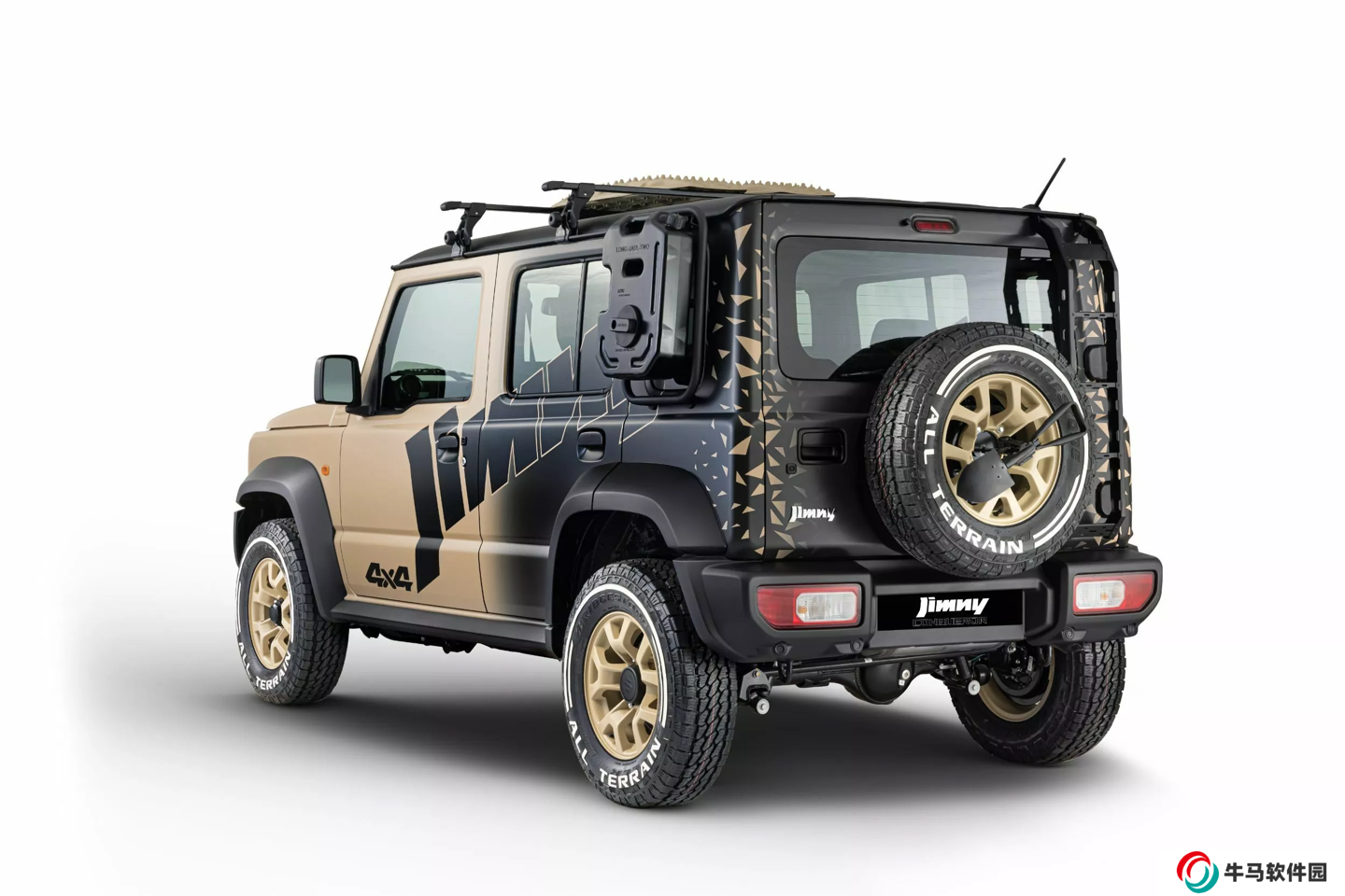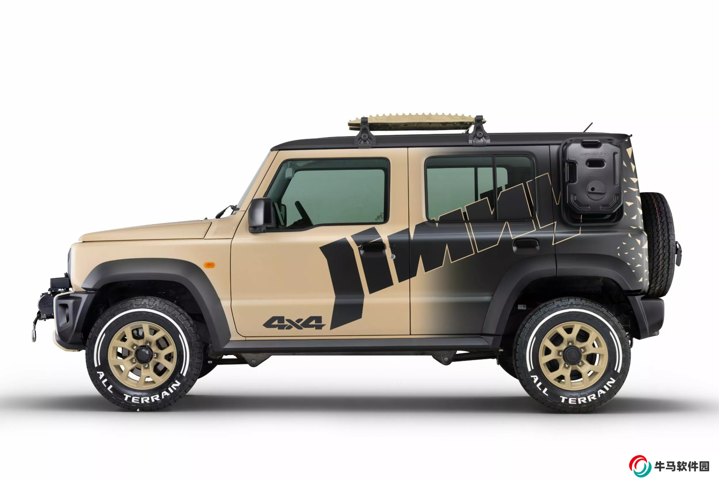 該車通過可選的越野配件展現(xiàn)了這款經(jīng)典越野車的硬派風(fēng)格。車身采用從沙漠色到黑色的漸變啞光涂裝,車側(cè)還印有 Jimny 4×4 字樣。