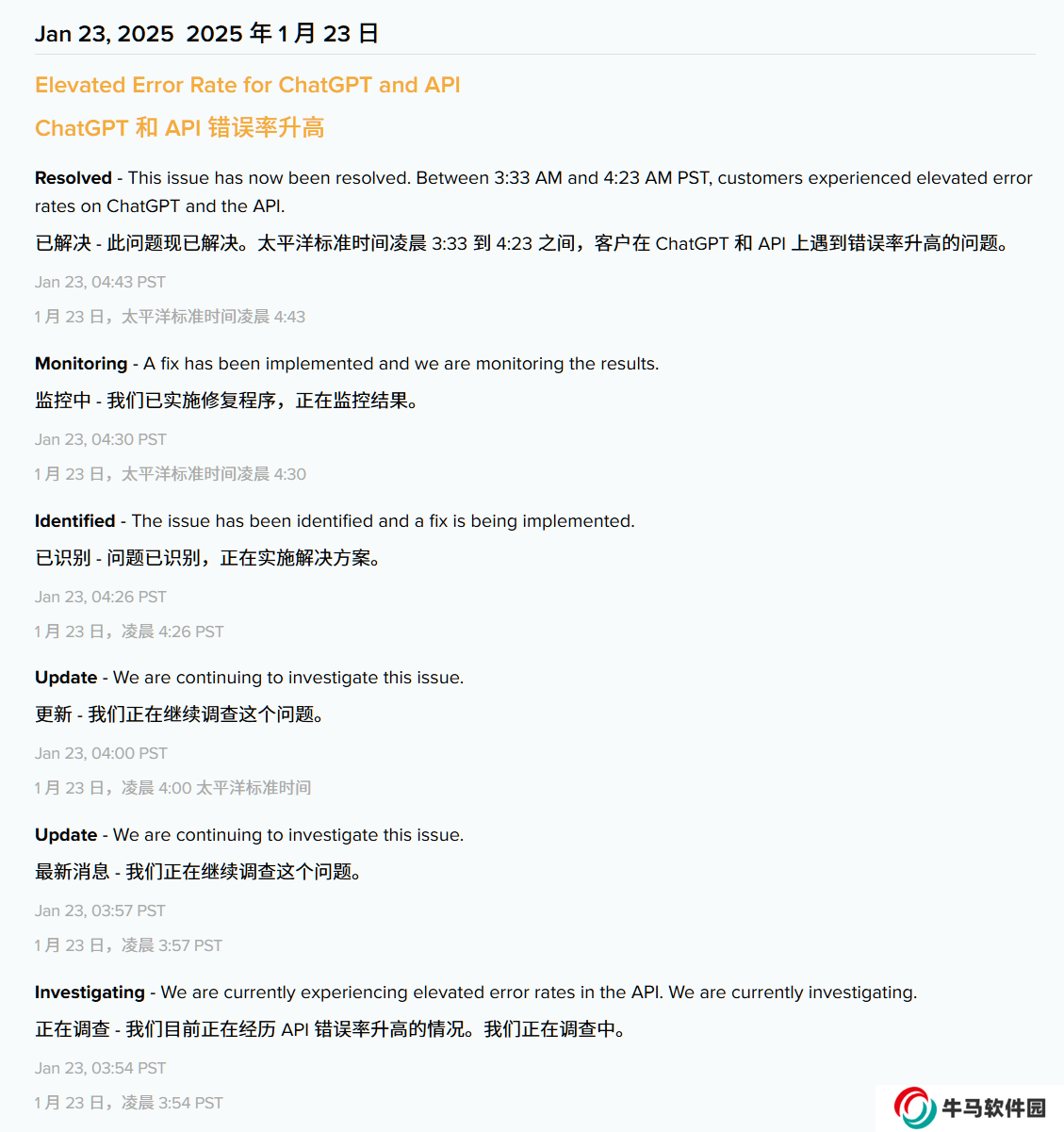 目前,ChatGPT 的狀態(tài)頁面確認(rèn)該服務(wù)正在經(jīng)歷較高的錯(cuò)誤率。OpenAI 公告稱已查明問題,發(fā)布了修復(fù)程序,并正在監(jiān)控結(jié)果。太平洋標(biāo)準(zhǔn)時(shí)間凌晨 4 時(shí) 43 分,OpenAI 稱此問題“已經(jīng)解決”。