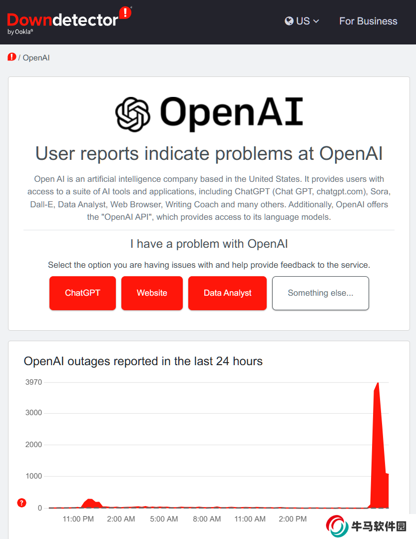 DownDetector 也顯示全球 OpenAI 宕機(jī)出現(xiàn)大幅飆升,可被視作 ChatGPT 無法正常工作的指標(biāo)。