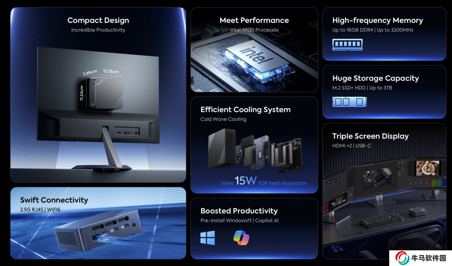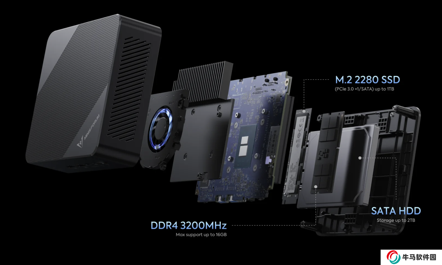 該機(jī)搭載4核4線程英特爾 N100 處理器,配備了16GB單通道DDR4-3200 RAM內(nèi)存條和256GB NVMe M.2 2280PCIe SSD,同時(shí)預(yù)留了2.5英寸SATA HDD插槽(兼容7mm以下),最大可擴(kuò)展至 2TB。