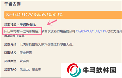 千巖古劍在游戲中是一把比較特殊的武器,因為千巖古劍的武器技能數值并不是固定的,而是根據隊伍中的角色來確定的,隊伍中的璃月角色越多,千巖古劍加成也就越高,因此使用千巖古劍的角色最好也是璃月角色。