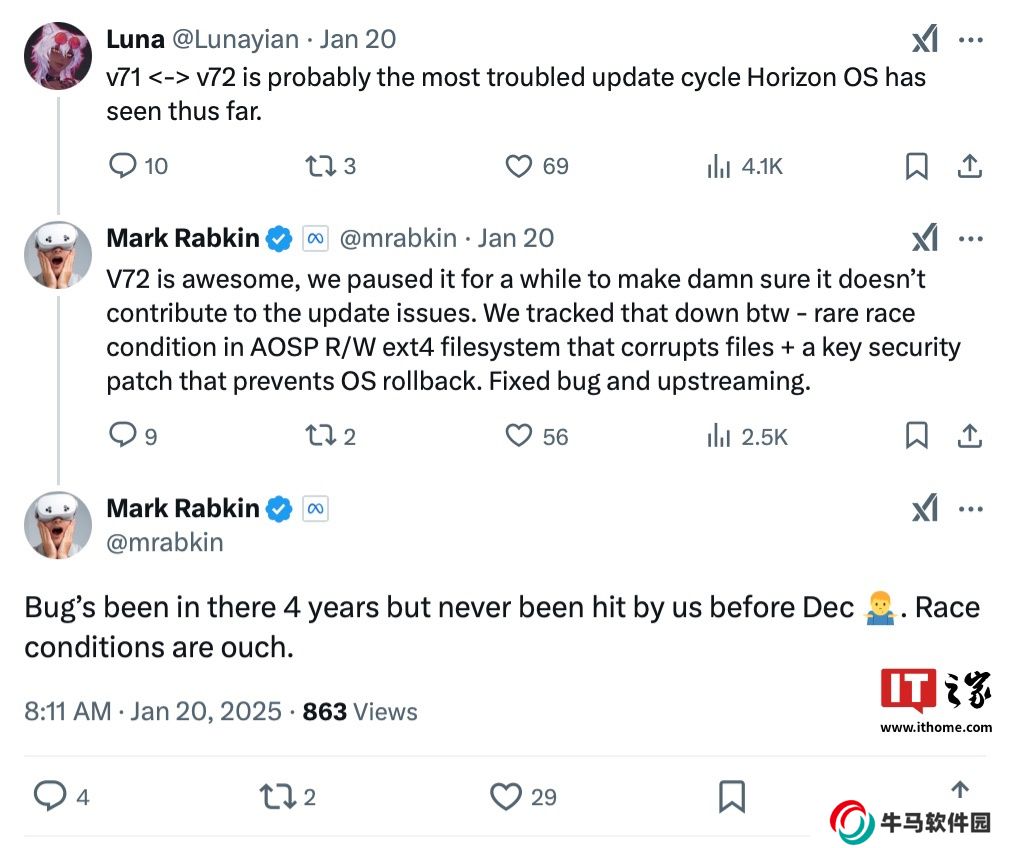 據(jù)其介紹,Meta Quest頭顯的 Horizon OS 基于 Android 開放源碼項(xiàng)目(AOSP)打造,其中的 ext4 文件系統(tǒng)在系統(tǒng)更新時(shí)觸發(fā)了罕見的“競(jìng)爭(zhēng)條件(racecondition)”錯(cuò)誤,也就是多個(gè)進(jìn)程同時(shí)讀寫同一資源,導(dǎo)致系統(tǒng)底層損壞,而頭顯又限制了系統(tǒng)回滾功能,從而導(dǎo)致相應(yīng)設(shè)備受到不可逆的損壞。