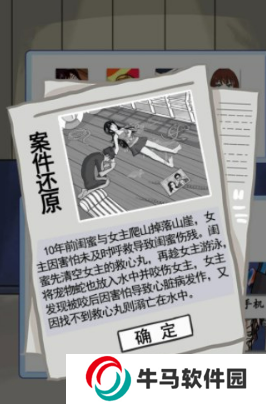 4.分析:死因-驚恐表情(嚇死的),兇器-空的速效救心丸,動機-10年前掉涯新聞,兇手-閨蜜。提交。