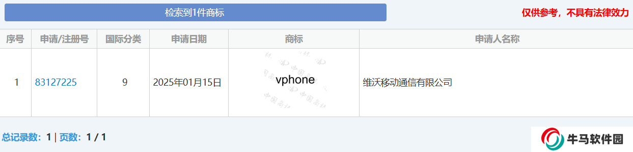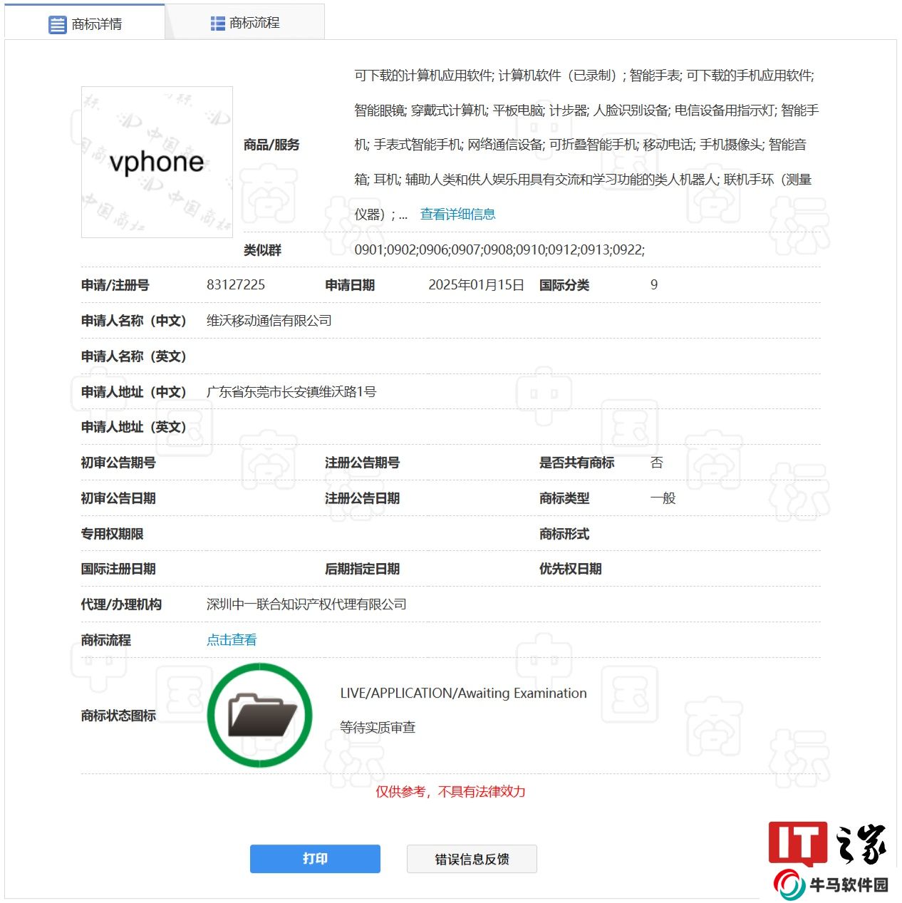 本站 2 月 12 日消息,中國(guó)商標(biāo)網(wǎng)信息顯示,2025 年 1 月 15 日,維沃移動(dòng)通信有限公司申請(qǐng)注冊(cè)了"vphone" 商標(biāo)。