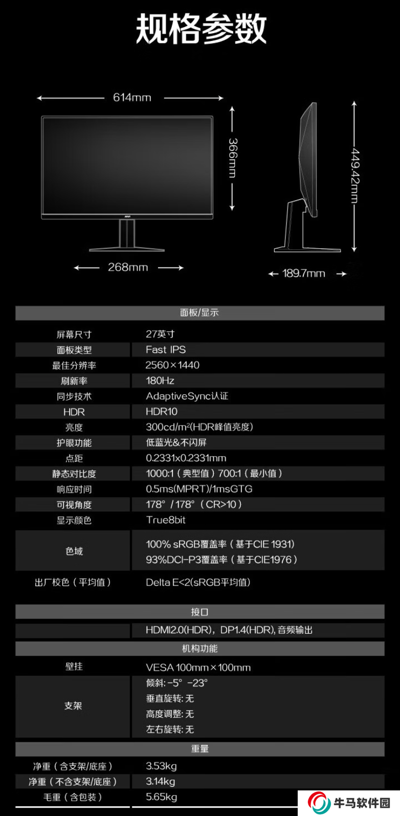 這款顯示器支架支持俯仰,顯示器本體支持VESA 100x100mm壁掛,提供2 個HDMI 2.0接口、1個 DP 1.4接口。