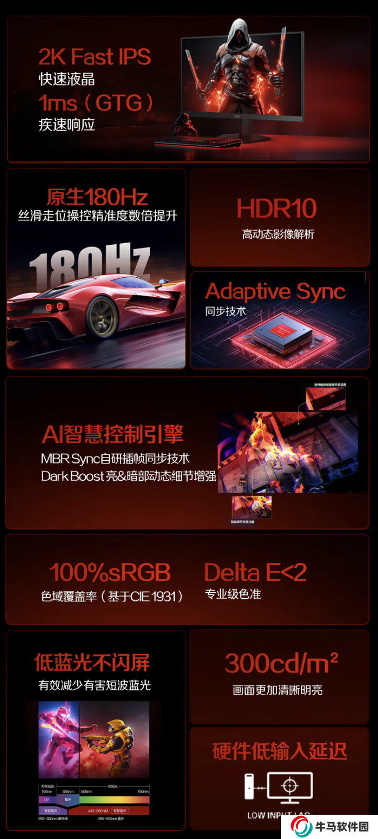 這款顯示器配備2560x1440分辨率原生180Hz Fast IPS面板,亮度300尼特,MPRT響應(yīng)速度0.5ms,GtG響應(yīng)速度 1ms,顯示器支持8-Bit色彩,覆蓋91% DCI-P3 色域。