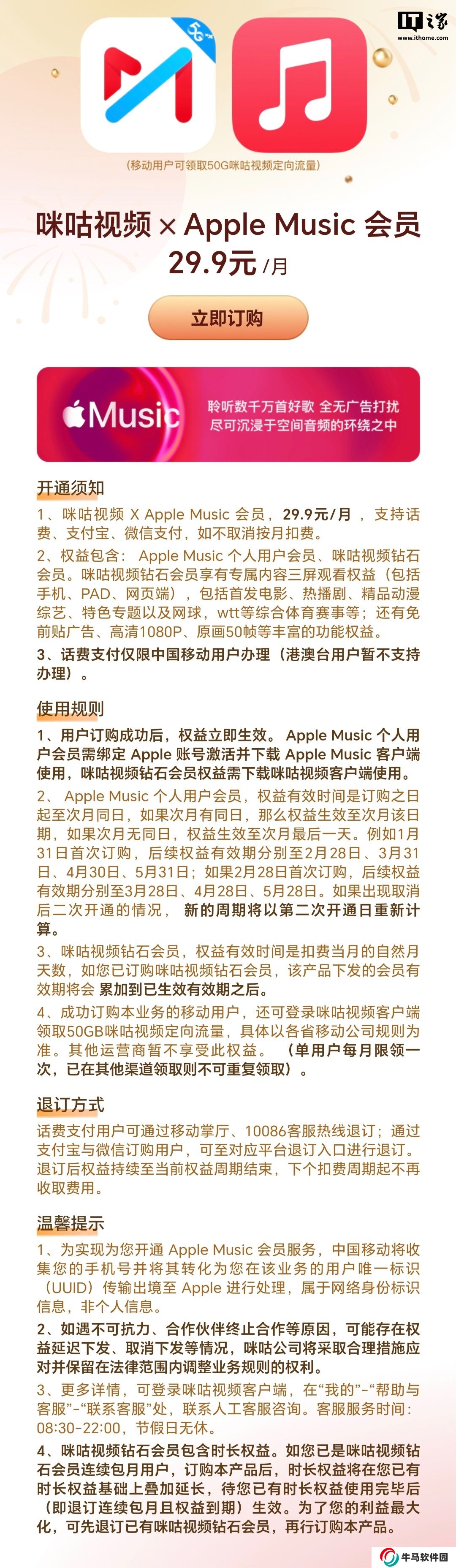 本站 2 月 2 日消息,中國移動發(fā)文,宣布上線咪咕視頻x蘋果 Apple Music 國區(qū)聯(lián)合會員,相應(yīng)會員定價為29.9元一個月,支持話費(話費支付僅限中國移動內(nèi)地用戶辦理)/支付寶 / 微信支付。