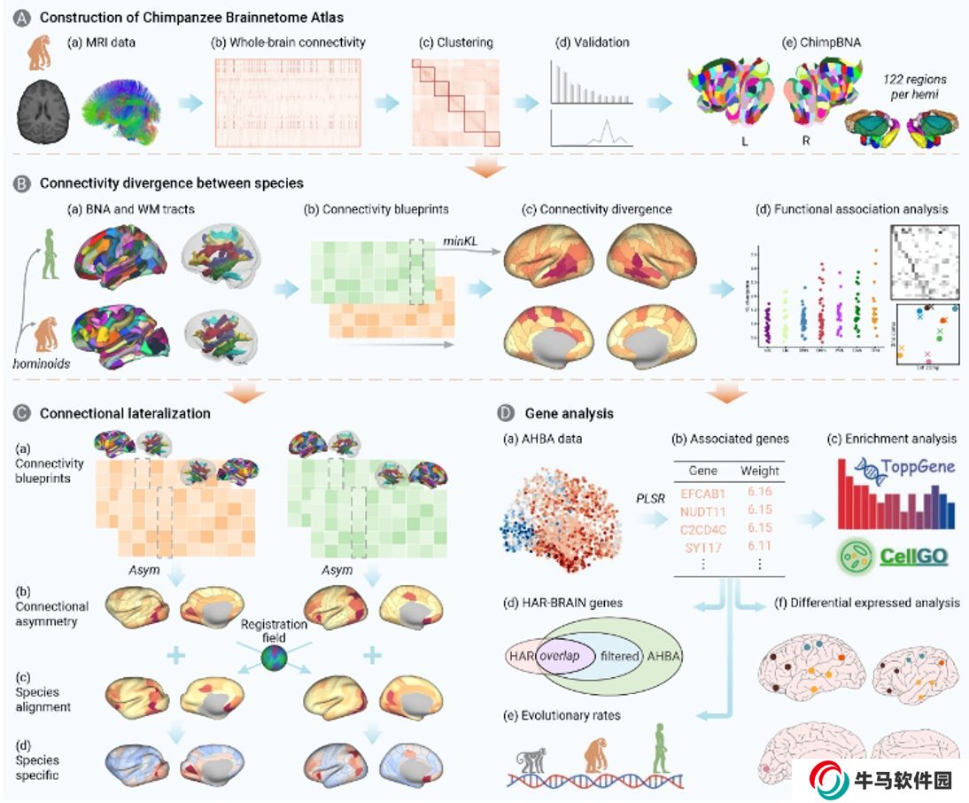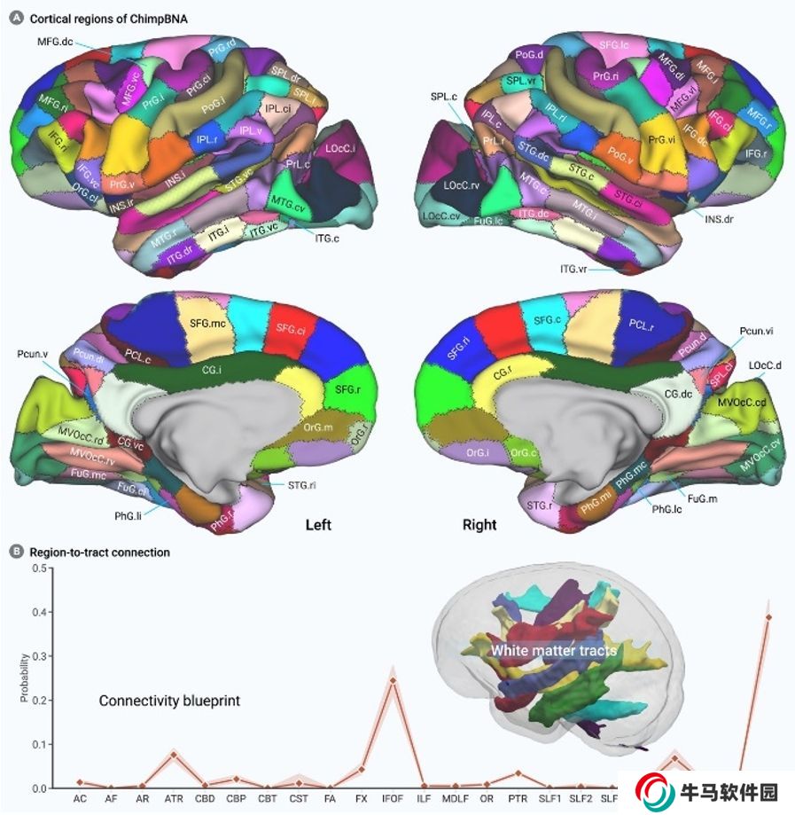 研究團隊基于腦連接信息繪制了 ChimpBNA,并重建了人類和黑猩猩同源的白質(zhì)纖維束,構(gòu)建了連接指紋圖,實現(xiàn)了亞區(qū)級別的跨物種腦連接差異分析。