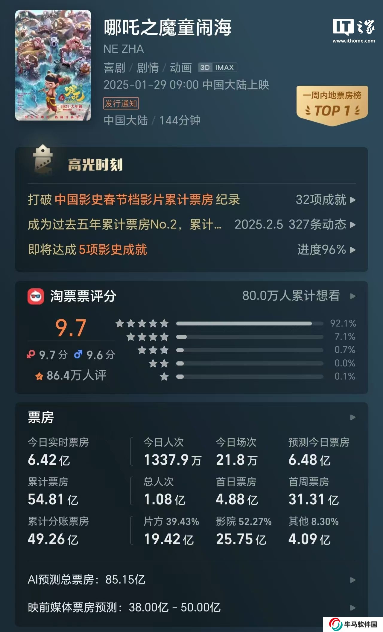 電影《哪吒之魔童鬧?!酚?2025 年 1 月 29 日起在中國大陸上映,目前豆瓣評分 8.5,今日實時票房 6.42 億、累計票房 54.81 億、累計分賬票房 49.26 億。影片講述了: