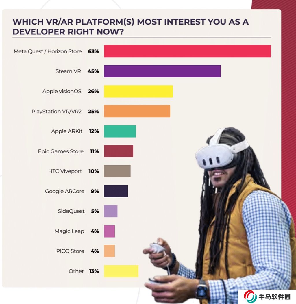 平臺(tái)吸引力方面,26% 的開(kāi)發(fā)者對(duì) visionOS 平臺(tái)高度感興趣,這一比例略高于 PlayStation VR2 (25%)。這表明 Vision Pro 在開(kāi)發(fā)者群體中具有較強(qiáng)的吸引力,其未來(lái)發(fā)展?jié)摿Σ蝗菪∮U。