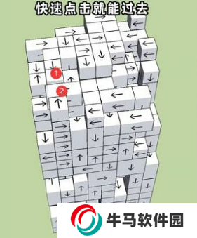 4、最后有些箭頭被擋住,如何有空隙的話,例如下圖中本來是1號擋住了2號,先點(diǎn)擊1號方塊,接著迅速點(diǎn)擊2號方塊,就可以將2號方塊移出去,不過這里一定要快才可以。