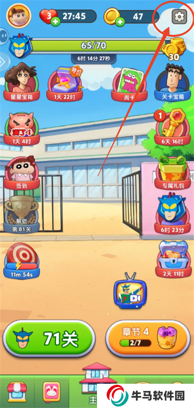 2.闖關(guān)至【11關(guān)】,解鎖主頁所有功能之后,點(diǎn)擊主頁【設(shè)置】按鈕,下圖所示;
