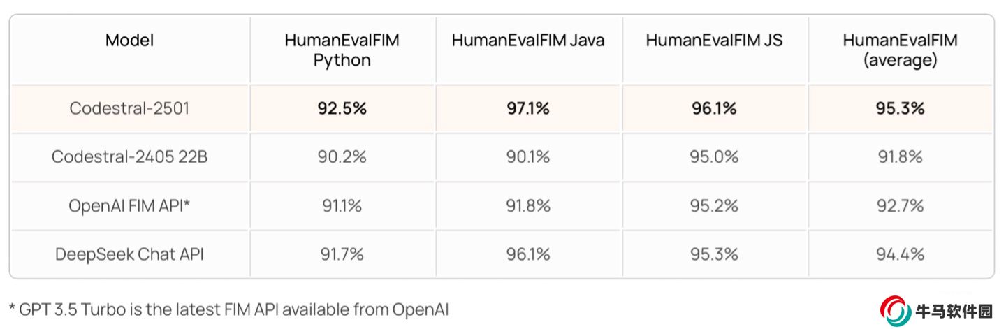 Mistral AI 聲稱(chēng),Codestral 25.01版本在 Fill-In-the-Middle(FIM)任務(wù)中刷新了多項(xiàng)基準(zhǔn)測(cè)試記錄,特別是在 FIM 的 Pass@1 測(cè)試中,平均通過(guò)率達(dá)到 95.3%,顯示出該模型在生成單行代碼方面的強(qiáng)大能力。