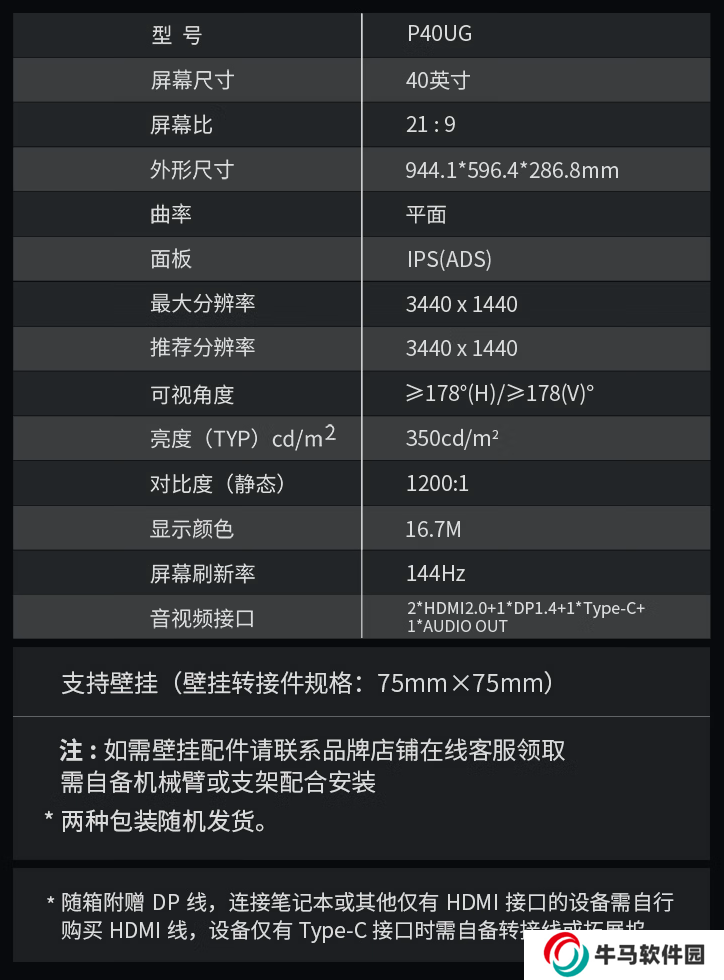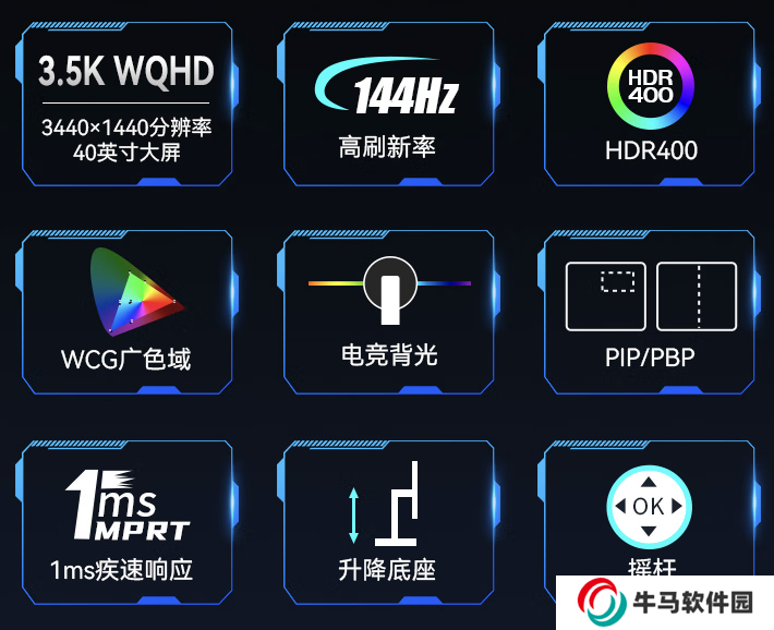 這款顯示器配備40 英寸21:9比例3440x1440分辨率144Hz IPS面板,亮度350尼特,靜態(tài)對比度1200:1,支持8-Bit色彩,覆蓋99% sRGB、88% AdobeRGB色域。支持PBP / PIP。