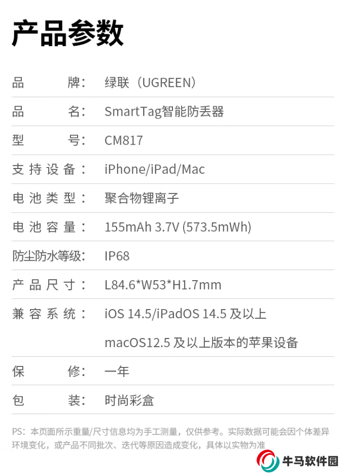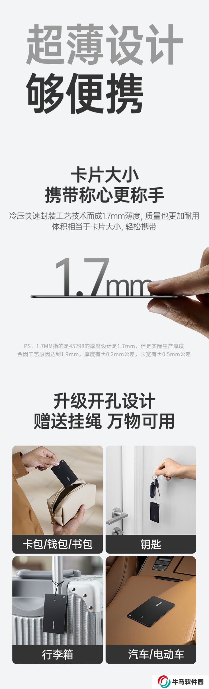 這款追蹤器號稱采用冷壓快速封裝工藝打造,整體厚度約1.7mm,支持IP68級別防塵抗水,追蹤器采用磁吸充電,內(nèi)置155毫安時(shí)電池,續(xù)航約1年。